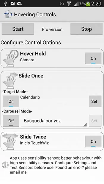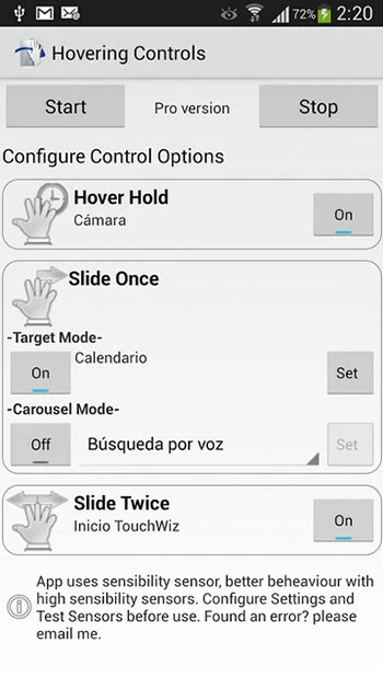 Sau khi cài đặt, người dùng có thể cấu hình các tính năng trên bên trong mục Configure Control Options, chạm vào nút On ở các mục Hover Hold (giữ tay lên cảm biến để mở ứng dụng), Slide Once (lướt tay qua cảm biến một lần để mở ứng dụng) và Slide Twice (lướt tay qua cảm biến hai lần) để kích hoạt và thiết lập các tính năng mong muốn.