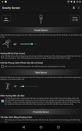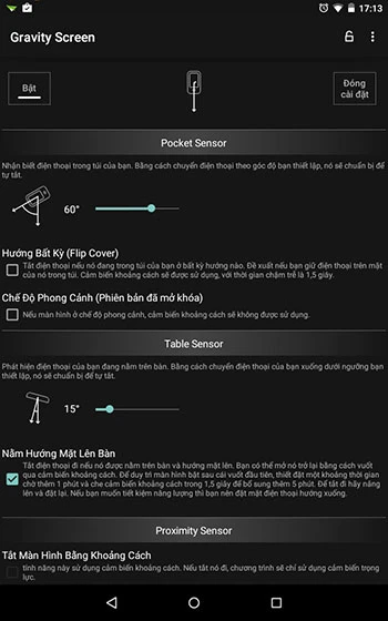 Gravity Screen cung cấp rất nhiều tùy chọn để bật/tắt màn hình như tắt màn hình khi để thiết bị nằm trên bàn và mặt hướng lên trên, tắt/bật màn hình bằng khoảng cách, bật màn hình bằng chuyển động,… và nhiều hơn thế nữa. Dù vậy nếu muốn gỡ bỏ ứng dụng, bạn phải vào Settings > Security > Device administrators, bỏ chọn Gravity Screen sau đó mới ra ngoài và gỡ như bình thường.