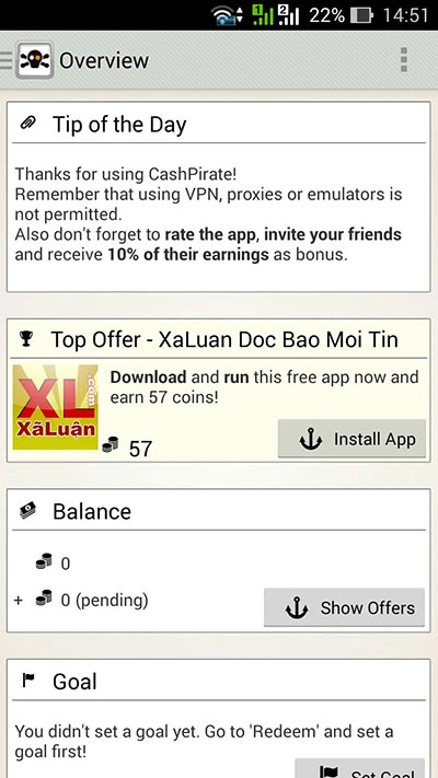 Đầu tiên bạn cần truy cập vào trang web paypal.com để tạo một tài khoản, sau đó bạn sẽ sử dụng ứng dụng kiếm tiền từ nhà phân phối. Đơn cử như ứng dụng CashPrirate (tải tại http://bit.ly/1HOmRBL). Sau khi download ứng dụng, bạn tìm kiếm các ứng dụng trên danh sách của CashPirate, sau đó tải về và cài đặt chúng. Với mỗi lần hoàn thành bạn sẽ được trả bằng các Coins. Với mỗi 2.500 Coins bạn sẽ nhận được tương đương 2,5 USD. Mỗi ứng dụng có số điểm từ 60 đến 110 Coins hoặc cao hơn. Lưu ý: Các ứng dụng sẽ xuất hiện ngẫu nhiên, trung bình 30 phút có một ứng dụng nên các bạn chú ý load ứng dụng để nhận tiền.