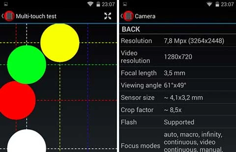 Bên cạnh đó, mục System information sẽ cung cấp các thông tin về phiên bản Android, kích cỡ màn hình, mật độ điểm ảnh, loại CPU, dung lượng RAM,… Hay mục Multi-touch test sẽ kiểm tra các điểm cảm ứng của máy.