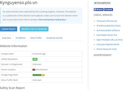 Sau đó kết quả sẽ được hiện ra nhanh chóng với các thống kê đầy đủ về địa chỉ IP, tên miền, máy chủ web, phần mềm độc hại, page rank, tỉ lệ phần trăm (nếu có) thông qua các thẻ tương ứng. Bên cạnh đó, mục Safety Scan Report còn cung cấp kết quả kiểm tra của những công cụ bảo mật đối với website này. Những mục nào có dấu check màu xanh có nghĩa là an toàn, nên bạn không cần phải lo lắng khi truy cập vào nó.
