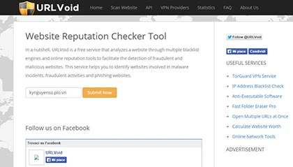 Đầu tiên, bạn truy cập vào địa chỉ http://urlvoid.com/ và nhập website cần kiểm tra tại ô Insert domain or subdomain to check sau đó nhấn Submit now .
