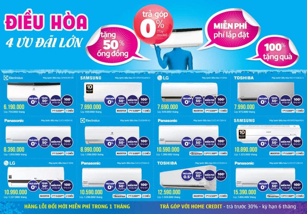 Được biết, từ nay đến 31-7, Điện máy Xanh đang có chương trình khuyến mãi cho nhiều dòng máy lạnh của các hãng lớn như Sony, Panasonic, Samsung, Toshiba, Electrolux, LG, với ưu đãi được tặng 50% chi phí ống đồng. Rất nhiều sản phẩm từ các hãng máy lạnh hàng đầu thế giới nằm trong chương trình khuyến mãi trên, người tiêu dùng có thể thoải mái chọn những sản phẩm mà mình yêu thích.