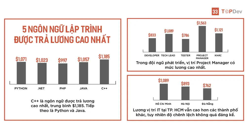 Ngoài ra, khảo sát của TopDev cũng chỉ ra rằng có đến 33.9% lập trình viên hướng tới việc phát triển những công nghệ chuyên sâu, 25% lập trình viên mong muốn hướng tới cấp quản lý. Trong đó, có đến 53% đang hài lòng với công việc của mình, 59.8% đang không có nhu cầu đổi việc. Vì vậy việc tuyển dụng ở các công ty sẽ trở nên khó khăn hơn trong năm 2019, đặc biệt là ở những vị trí cao cấp như Project Manager, dù mức lương có lên đến gần 40 triệu đồng/tháng.