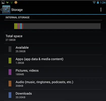 Để xem tổng quan về các loại tập tin đang chiếm dụng không gian trên thiết bị, bạn truy cập vào menu Settings > Storage, và chờ một lát để Android tính toán hoàn tất. Tại đây, bạn có thể nhấp vào một loại tập tin bất kì để xóa như Apps (các ứng dụng), Pictures, Videos (hình ảnh và video),vv…