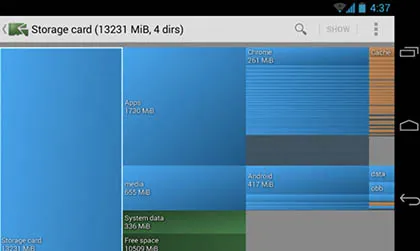 Đối với hai mục Downloads và Cached data, bạn có thể xóa toàn bộ các tập tin có trong này để lấy lại không gian lưu trữ nhanh hơn. Nếu bạn muốn có một cái nhìn tổng quan hơn khi xóa tập tin, thì hãy cài đặt ứng dụng DiskUsage (http://goo.gl/T575s). Việc bạn cần làm chỉ là chọn vào các mục mà nó liệt kê, rồi thực hiện xóa bỏ bớt là được.