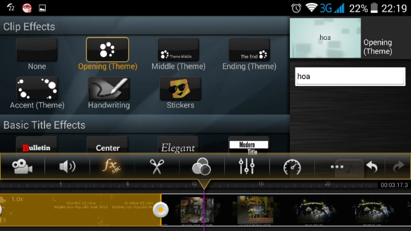 Khi chạm vào phần hiển thị video, bạn sẽ thấy xuất hiện một thanh menu nhỏ nằm ngay bên dưới. Để áp dụng các hiệu ứng độc đáo như Handwriting (tạo chữ viết tay), Stickers (chèn vào các biểu tượng cảm xúc), Accent…bạn chỉ cần chạm vào biểu tượng Fx.