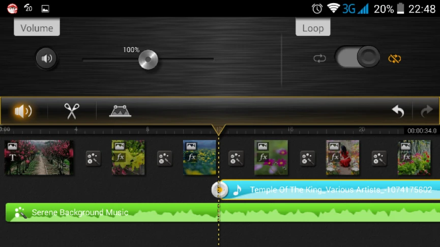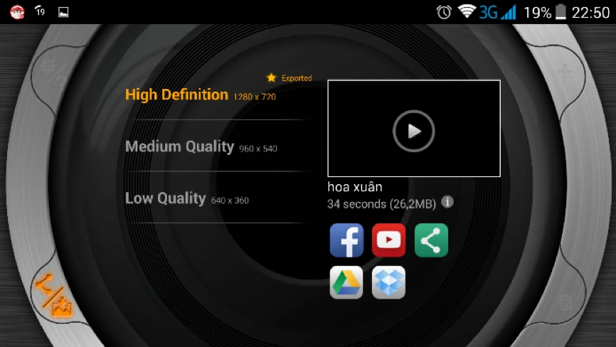 Để tăng phần hấp dẫn cho video, bạn nên chèn thêm các tập tin âm thanh có sẵn trong máy, sau đó chỉnh sửa lại hiệu ứng Fade in/Fade out để đạt được hiệu quả cao hơn. Khi đã hoàn tất mọi thứ, bạn quay trở lại giao diện lúc ban đầu, chạm vào biểu tượng chia sẻ ở góc trái bên dưới, lựa chọn chất lượng video là High, MediumhayLow rồi nhấn Exportvà chờ một lát để hoàn tất. Cuối cùng, người dùng có thể chia sẻ nó lên các dịch vụ mạng xã hội như Facebook, YouTube, Google Drive hay Dropbox chỉ với một thao tác chạm đơn giản.