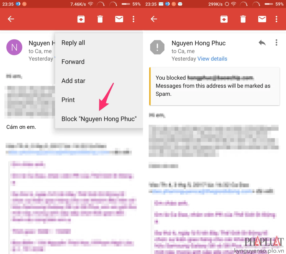 - Bước 2: Chạm vào menu ba chấm ở góc trên bên phải và chọn Block <tên người gửi>. Lúc này, trên màn hình sẽ xuất hiện thông báo cho biết toàn bộ email được gửi từ người này sẽ được chuyển vào thư mục Spam. Nếu muốn bỏ chặn, bạn chỉ cần thực hiện ngược lại.