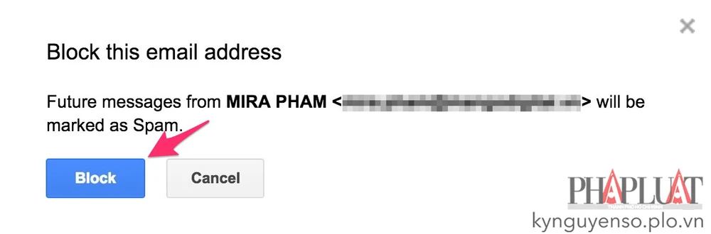 - Bước 2: Tiếp theo, bạn tìm đến email cần chặn, bấm vào biểu tượng mũi tên ở góc phải và Block <tên người gửi>. Trong cửa sổ mới hiện ra, người dùng chỉ cần nhấn Block để xác nhận lại một lần nữa.