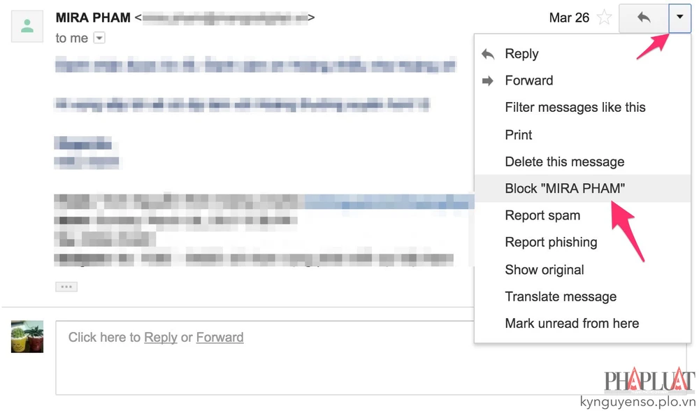 Lưu ý, nếu muốn bỏ chặn, bạn chỉ cần nhấp vào một email bất kì do họ gửi đến, nhấn vào biểu tượng mũi tên ở góc phải và chọn Unblock <tên người gửi>.