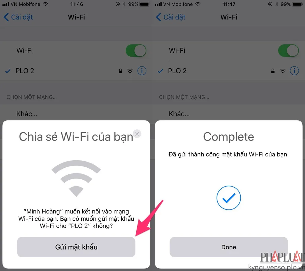 - Bước 3: Lúc này, trên màn hình thiết bị của bạn sẽ xuất hiện thông báo hỏi có muốn gửi mật khẩu WiFi cho bạn bè không? Nếu có, người dùng chỉ cần nhấp vào tùy chọn Send password (gửi mật khẩu) > Done (xong). Lưu ý, nếu đang sử dụng các thiết bị đời cũ, thời gian chờ có thể sẽ lâu hơn đôi chút.