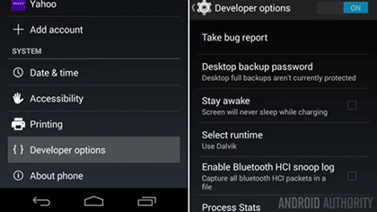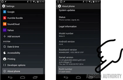 Các bước dưới đây được thực hiện trên thiết bị chạy Android KitKat 4.4.4, đối với các phiên bản Android khác, bạn cũng thực hiện tương tự hoặc tìm các tùy chọn tương ứng. Đầu tiên, bạn truy cập vàoSettings, di chuyển xuống dưới cùng để tìm mục About Phone (hoặc About Tablet), sau đó chạm vào mục Build number vài lần cho đến khi xuất hiện thông báo You will become a Developer là được. Lúc này, bạn quay ngược trở lại Settings > Developerđể xem một loạt các tùy chọn mới vừa được hiển thị thêm ở đây.