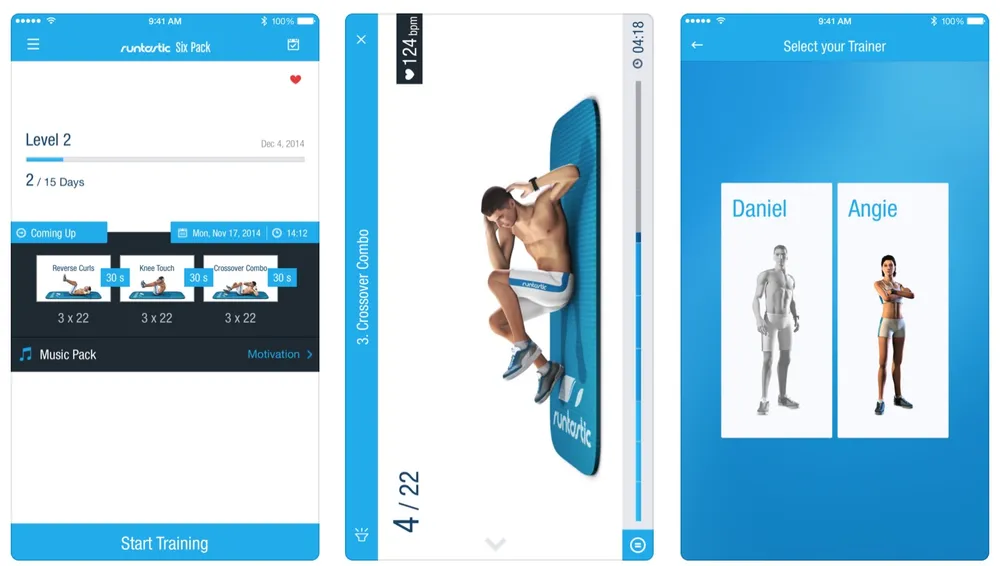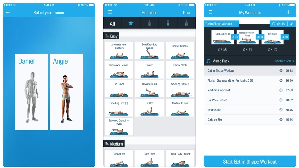 Ứng dụng cung cấp khá nhiều bài tập bằng hình ảnh từ cơ bản đến nâng cao và những video hướng dẫn rất sống động. Đầu tiên, tại mục Select your Trainer, bạn chọn cho mình huấn luyện viên ảo là Daniel hoặc Angie.