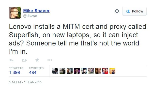Vụ kiện đã khởi tố ngay sau khi Lenovo thừa nhận cài sẵn phần mềm Superfish trên một số máy tính cá nhân của người tiêu dùng. Các máy tính xách tay bị ảnh hưởng bởi Superfish bao gồm: G Series, U Series, Y Series, Z Series, S Series, Flex, Miix, Yoga và E Series. Lenevo đã nhanh chóng đưa ra các hướng dẫn gỡ bỏ ứng dụng Superfish và các chứng chỉ số giả mạo ra khỏi máy tính. Microsoft và McAfee cũng đã cập nhật cho các công cụ bảo mật Windows Defender và McAfee Internet Security để loại bỏ sạch sẽ Superfish hôm thứ 6 vừa qua.