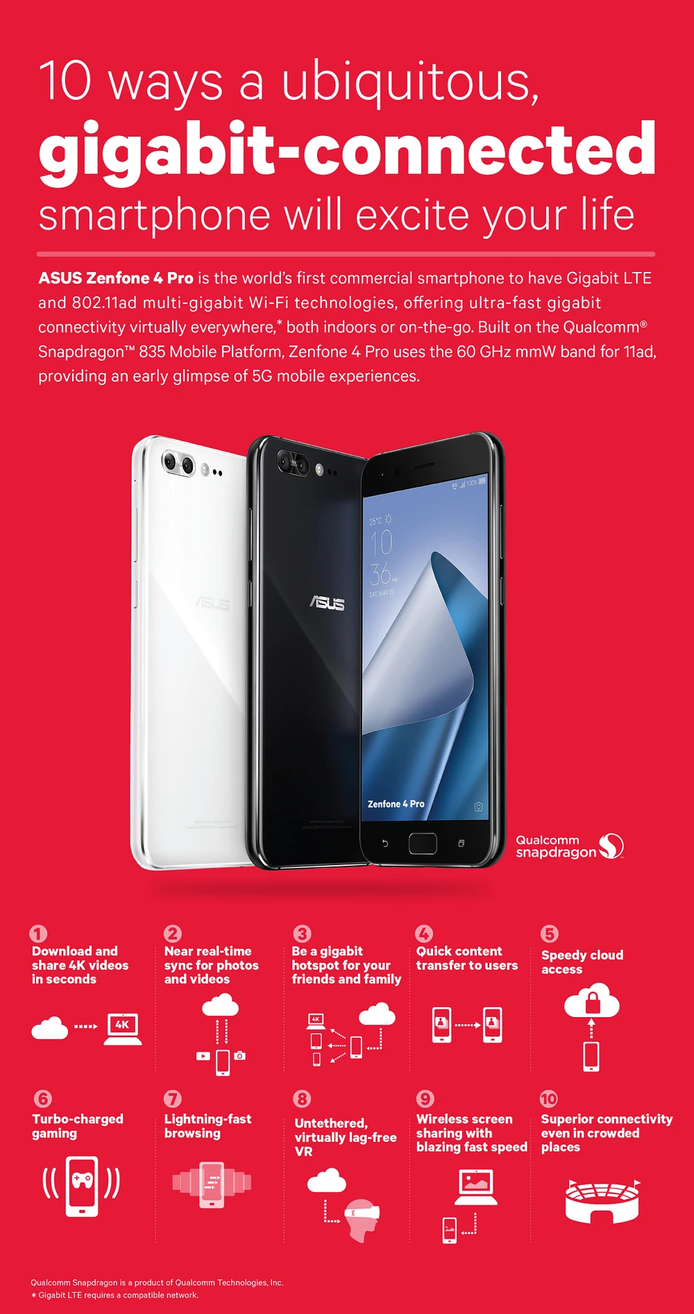 Được tích hợp vào nền tảng di động Snapdragon 835, modem Snapdragon X16 Gigabit LTE mang đến cho ZenFone 4 Pro tốc độ tải xuống cực nhanh với mạng 4G LTE, trên một mạng tương thích LTE, và chất lượng tín hiệu tốt với công nghệ ăng-ten kép Qualcomm® TruSignal™ giúp mở rộng phạm vi kết nối. Công nghệ Wi-Fi 11ad của Qualcomm giúp người dùng có thể tải xuống và chia sẻ video chất lượng 4K chỉ trong vài giây, đồng bộ hóa hình ảnh, video và các tập tin khác chỉ trong nháy mắt, và tận hưởng dịch vụ đám mây với kết nối cực nhanh.