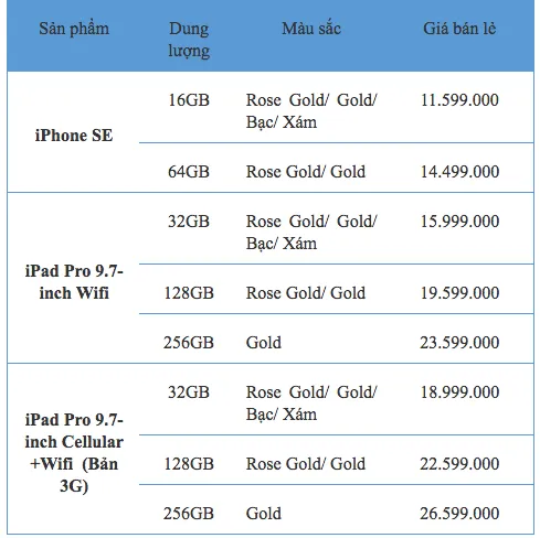 Vừa qua, phía FPT Shop cũng đã hé lộ thông tin về giá bán iPhone SE và iPad Pro 9,7 inch chính hãng tại Việt Nam.