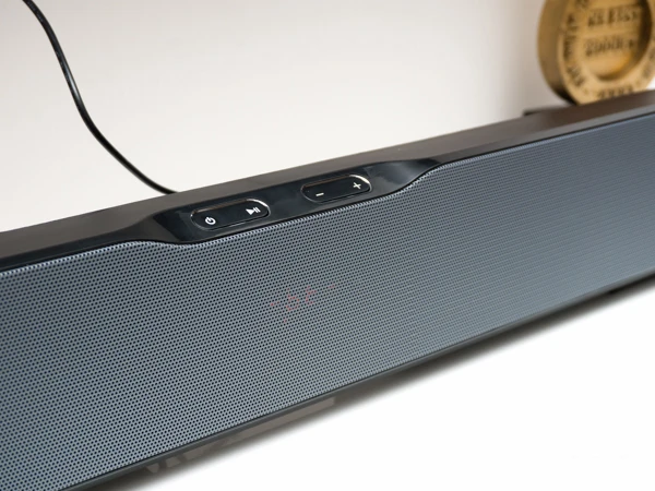 Mặt trước của thanh loa được trang bị màn hình LCD nhằm hiển thị các thông tin quan trọng như chuẩn kết nối (Bluetooth, cáp quang,...) và các nút chức năng cơ bản (nhấn im để điều chỉnh). Đi kèm theo đó là chiếc remote đa năng và các phụ kiện dùng để đặt loa trên mặt phẳng hoặc treo tường.