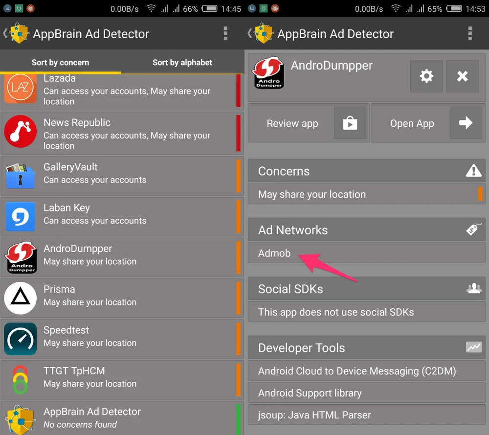 - Bước 2: Mặc định, AppBrain Ad Detector sẽ tự động kiểm tra và hiển thị thông tin về các ứng dụng phiền nhiễu hoặc phần mềm độc hại, có thể đánh cắp dữ liệu cá nhân và khiến người dùng bị mất tiền. Ngoài ra, ứng dụng này còn liệt kê danh sách các mạng quảng cáo được nhúng trong từng ứng dụng, đơn cử như AdMob, Millennial Media, ChartBoost, Tapjoy...