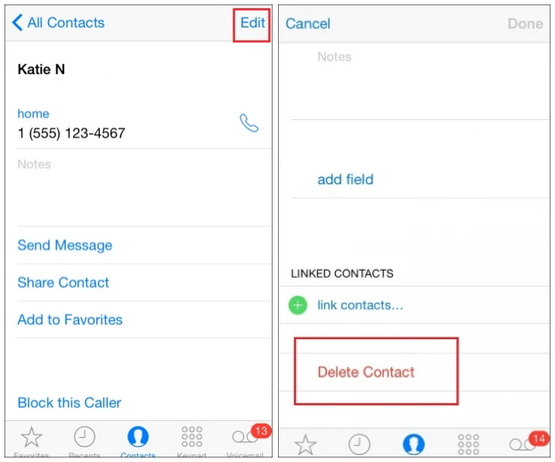 Cách này chỉ thích hợp khi số lượng các địa chỉ giống nhau không nhiều. Đầu tiên, bạn chạm vào một địa chỉ bị trùng lặp rồi nhấn nút Edit ở góc trên bên phải. Trong cửa sổ tiếp theo, bạn chỉ cần kéo xuống cuối trang và nhấp vào lựa chọn Delete Contact, xác nhận lại việc này để thiết bị xóa hoàn toàn số điện thoại bị trùng lặp.