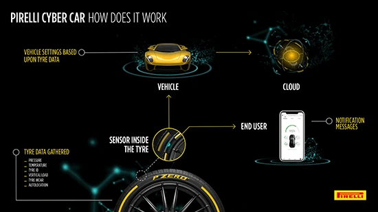 Công nghệ Cyber Car của Pirelli dựa vào một cảm biến được đặt bên trong lốp xe, kết nối với Pirelli Cloud. Chỉ nặng vài gram nhưng cảm biến có thể theo dõi trạng thái của lốp xe và truyền dữ liệu đó đến một bộ điều khiển điện tử bên trong xe.