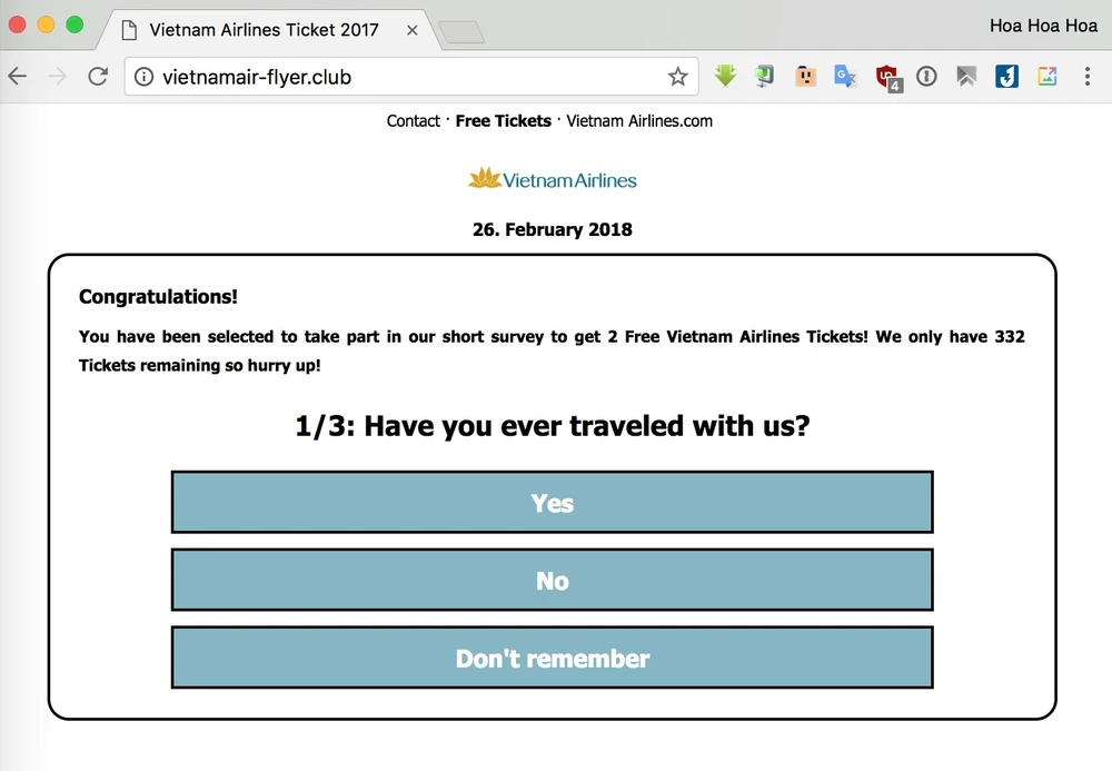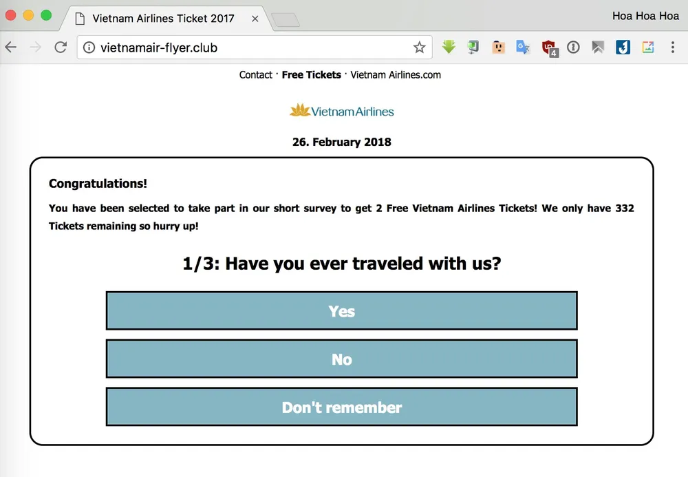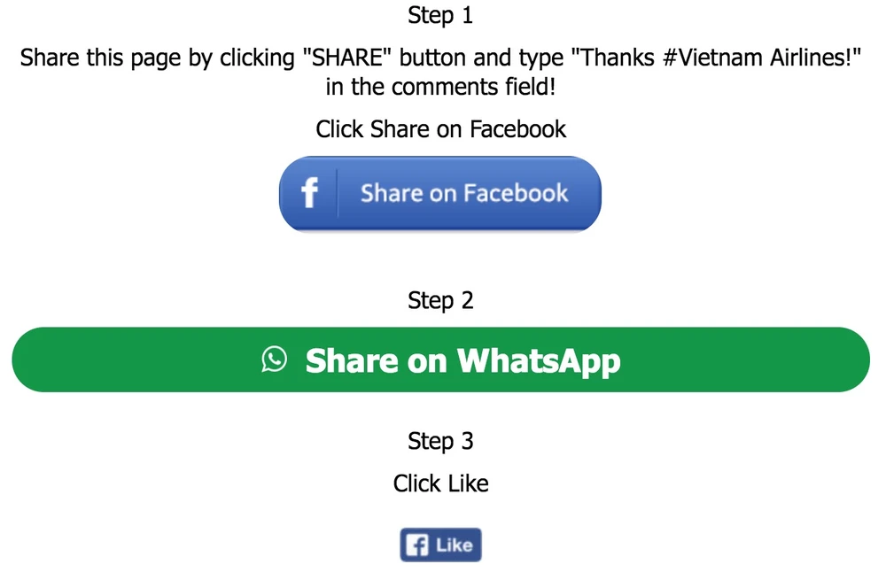 Cụ thể, kẻ gian sẽ dụ người dùng truy cập vào các trang web giả mạo và yêu cầu làm khảo sát, chia sẻ thông tin lên mạng xã hội Facebook, WhatsApp để được nhận hai vé máy bay Vietnam Airlines miễn phí. Việc này sẽ vô tình khiến bạn bị thu thập thông tin cá nhân và tiếp tay cho hành vi lừa đảo.