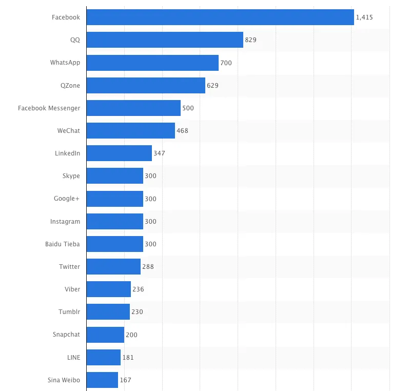 Hiện thế giới có hơn 18 mạng xã hội khác nhau và vị trí dẫn đầu không ai khác đó chính là Facebook, với hơn 1,4 tỷ người đang hoạt động mỗi tháng, tiếp theo là mạng xã hội QQ của Trung Quốc với 829 triệu và Whatsapp giữ vị trí thứ ba với hơn 700 triệu.