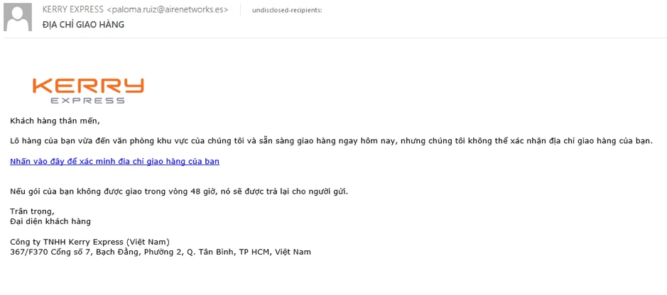 Hệ thống giám sát SOC của CyRadar đã phát hiện một số người bị tấn công qua hình thức này. Nội dung email đại loại sẽ có dạng: “Lô hàng của bạn vừa đến văn phòng khu vực của chúng tôi và sẵn sàng giao trong ngày hôm nay nhưng chúng tôi không thể xác nhận địa chỉ giao hàng của bạn. Nhấn vào đây để xác minh địa chỉ giao hàng của bạn”.