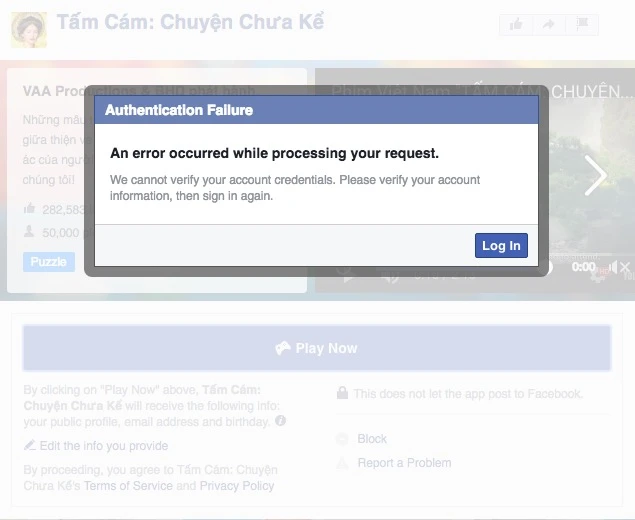 Theo đó, khi người dùng nhấp vào nút Play Now để chơi, trên màn hình sẽ xuất hiện hộp thoại nhỏ kèm thông báo lỗi và yêu cầu Log In (đăng nhập) lại một lần nữa trong khi thực tế bạn vẫn đang đăng nhập Facebook.