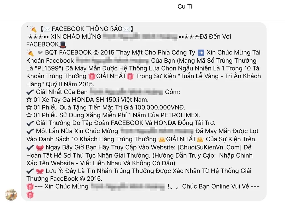 Ngoài ra, kẻ gian còn sử dụng các tài khoản Facebook bị hack và gửi tin nhắn đến người dùng với nội dung trúng thưởng xe SH150i hoặc nạp thẻ cào nhân 10. Để nhận được xe SH150i, bạn phải truy cập vào trang web giả mạo do kẻ gian chỉ định, sau đó đăng nhập bằng tài khoản Facebook. Nếu làm theo, tài khoản của bạn sẽ ngay lập tức bị chiếm đoạt và sử dụng vào mục đích xấu hoặc bán lại cho các bên thứ ba như bảo hiểm, nhà đất, bán SIM...