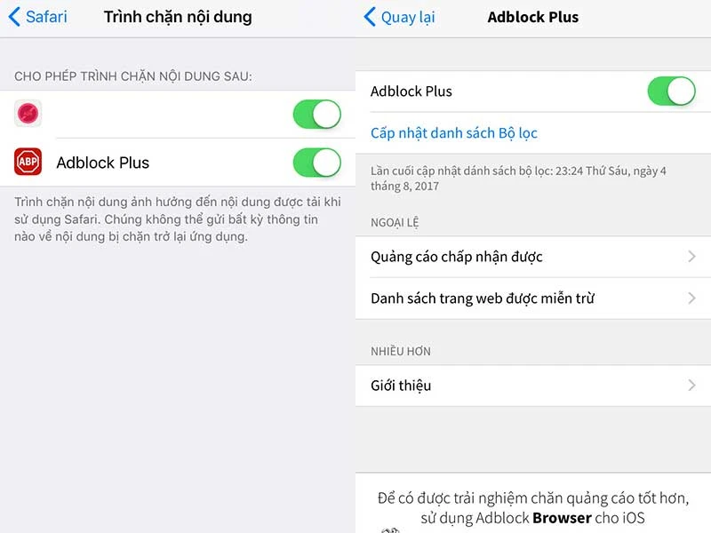Tiếp theo, bạn vào phần Cài đặt -> Safari -> Trình chặn nội dung và kích hoạt tùy chọn Adblock Plus. Khi hoàn tất, người dùng có thể mở ứng dụng Adblock Plus và cấu hình lại một vài thông số bằng cách bấm vào biểu tượng Settings ở ngay bên dưới.