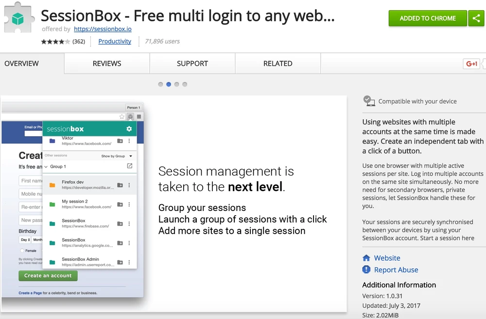 - Bước 1: Đầu tiên, bạn hãy cài đặt tiện ích mở rộng SessionBox cho Google Chrome (Cốc Cốc, Opera, Yandex… hoặc các trình duyệt sử dụng mã nguồn mở Chromium) tại địa chỉ https://goo.gl/0zxbkt (Add to Chrome > Add extension). Về cơ bản, SessionBox sẽ tự động tạo ra các phiên làm việc mới, cho phép người dùng đăng nhập cùng lúc nhiều tài khoản trên cùng một trình duyệt.