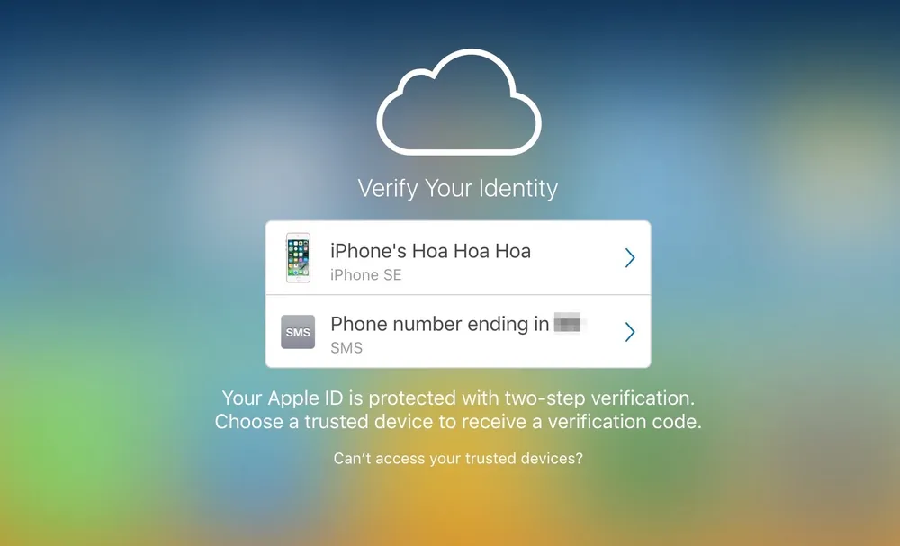 Kể từ bây giờ, mỗi khi đăng nhập vào iCloud, bạn cần phải nhập mật khẩu và thực hiện việc xác thực lại một lần nữa thông qua mã bảo mật được gửi đến điện thoại hoặc thiết bị tin cậy do người dùng thiết lập (như hình bên dưới). Điều này đồng nghĩa với việc nếu tin tặc có được mật khẩu của bạn, họ cũng không thể xâm nhập vào tài khoản.