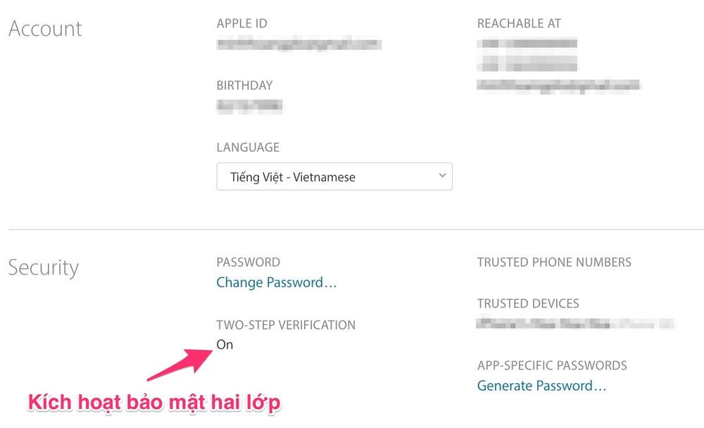 Kích hoạt tính năng bảo mật hai lớp cho tài khoản iCloud. Ảnh: TIỂU MINH