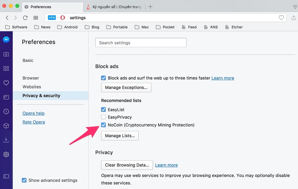 Bật tính năng ngăn chặn đào bitcoin trên trình duyệt Opera 50. Ảnh: MINH HOÀNG