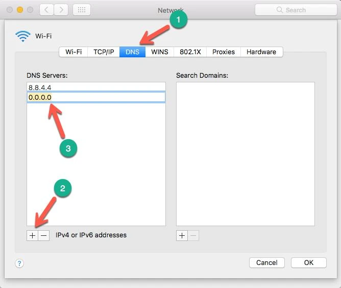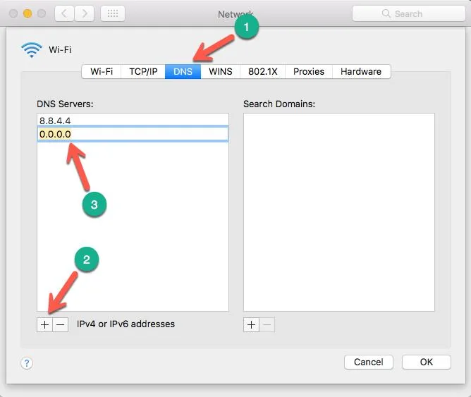 Tiếp theo, chuyển sang thẻ DNS, kích vào biểu tượng dấu cộng và nhập vào DNS tương ứng, sau đó nhấn Apply - OK để lưu lại. Ví dụ, Google DNS (8.8.8.8, 8.8.4.4), Open DNS (208.67.222.222, 208.67.220.220)…