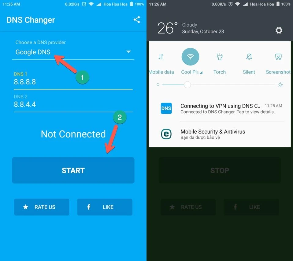 Sau đó nhấn Start để thay đổi, tình trạng kết nối sẽ được hiển thị ngay trên thanh thông báo, bạn có thể theo dõi hoặc thay đổi lại chỉ với một cú chạm.