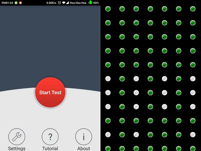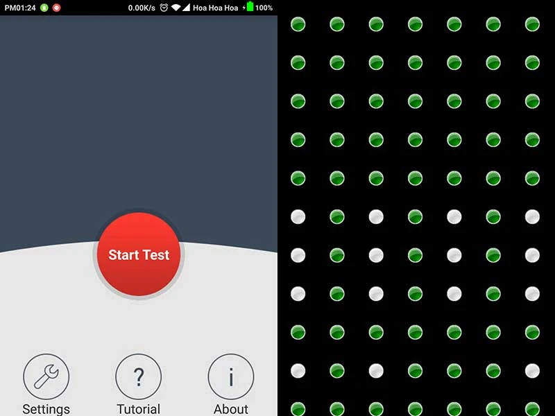 Ban đầu ứng dụng sẽ hiển thị một loạt chấm trắng trên màn hình, việc bạn cần làm là chạm vào chúng để kiểm tra tính năng cảm ứng. Tiếp theo, LCD Screen Tester sẽ đổi màu màn hình, lúc này bạn nên chú ý xem trên màn hình có xuất hiện điểm nào lạ hay không, nếu có thì đây chính là điểm chết, nơi màu sắc không thể hiển thị. Lưu ý, nếu thiết bị có từ năm điểm chết trở lên, bạn không nên mua sản phẩm này.