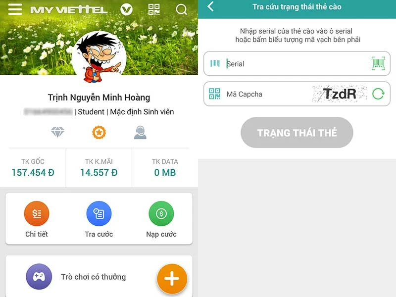 Tại giao diện chính, người dùng chỉ cần bấm vào tùy chọn Nạp cước > Tra cứu trạng thái thẻ cào, nhập số serial trên thẻ vào khung trống và mã bảo mật tương ứng rồi nhấn Trạng thái thẻ. Lúc này My Viettel sẽ trả về toàn bộ thông tin như trạng thái thẻ, số tiền và ngày hết hạn.