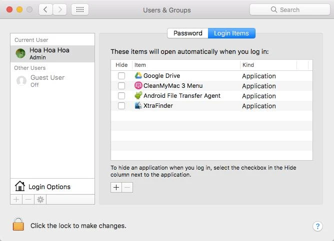 Nếu đang sử dụng MacBook, bạn hãy nhấp vào logo Apple ở góc trên bên trái, chọn System Preferences > User & Group > Login Items, bỏ chọn tại các mục không cần thiết hoặc nhấn vào biểu tượng “-“ để xóa bỏ.