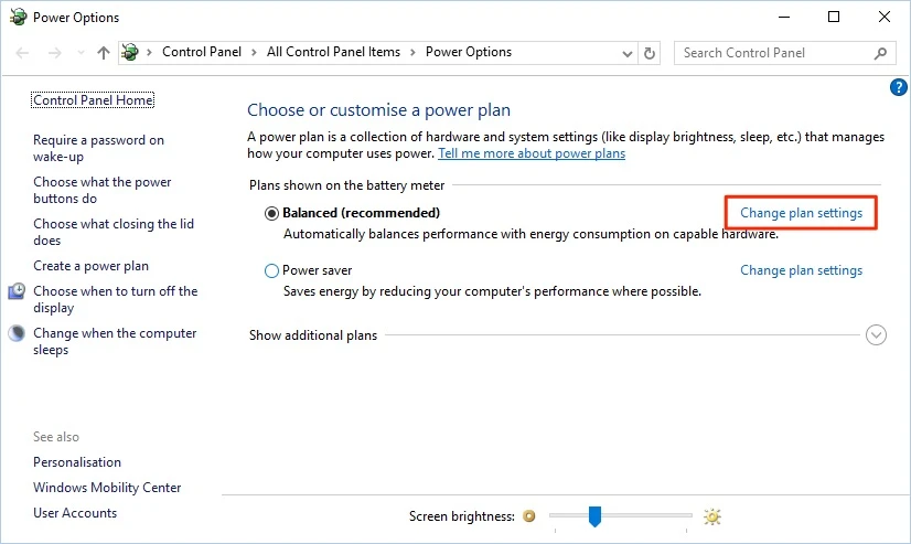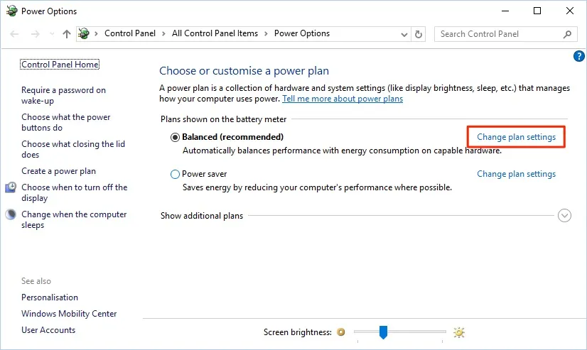 Trong cửa sổ mới hiện ra, người dùng chỉ cần bấm vào liên kết Change plan settings > Change advanced power settings.
