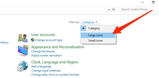 - PC: Bạn hãy mở Control Panel, bấm nút Category bên cạnh mục View by ở phía trên góc phải và chọn Large icons > Power Options.