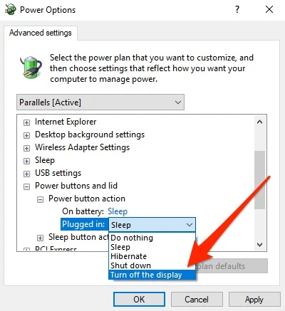 Nếu muốn thay đổi chức năng, người dùng có thể bấm vào nút Sleep và chọn Do nothing để vô hiệu hoá nút Power hoặc chọn Hirbernate (ngủ đông), Shutdown (tắt máy) hay Turn off the display (tắt màn hình) rồi nhấn Apply > OK để lưu lại.