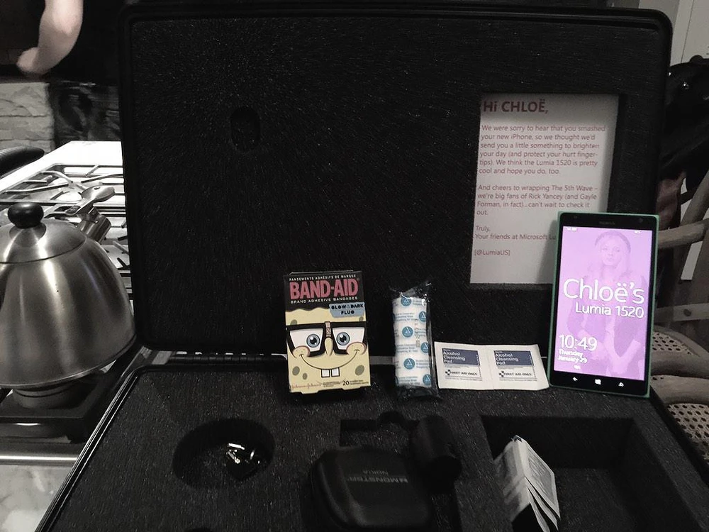 Bên trong gói quà của Microsoft là một chiếc Lumia 1520 và một cặp tai nghe Nokia/Monster. Bên cạnh đó Microsoft cũng gửi cho Chloë bông băng và các miếng gạc để chữa lành viết thương từ ngón tay của cô do kính bị vỡ từ iPhone.