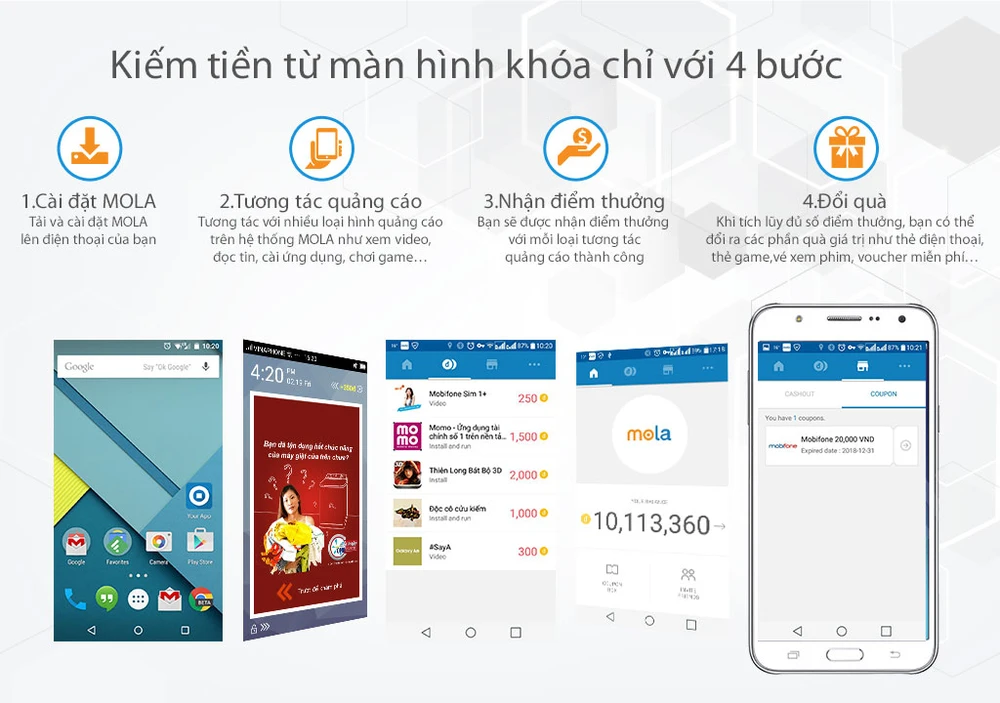 Bốn bước kiếm tiền với ứng dụng Quảng cáo trả thưởng trên màn hình khóa di động Mola.