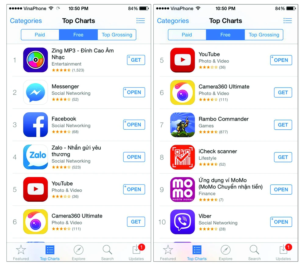 Cùng đứng trong top 10 này còn có các ứng dụng, như: Facebook Messenger, Youtube, Viber… và các game Mobile. MoMo hiện cũng là từ khóa có xu hướng tìm kiếm trong top 10 trên AppStore. Trước đó, trên Google Play, ứng dụng MoMo luôn đứng vị trí dẫn đầu các ứng dụng tài chính miễn phí (Top Free in Finance) kể từ tháng 6-2014 đến nay.