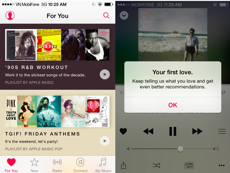 Giao diện của Apple Music đơn giản, thiết kế đẹp mắt gồm có 5 thẻ chính là For You, New, Radio, Connect và My Music. Trên thẻ For You, Apple sẽ gợi ý cho người dùng những playlist nhạc tiêu biểu từ chính thể loại nhạc bạn đã chọn ban đầu. Trong mỗi playlist đều có phần mô tả sơ lược và bạn chỉ cần nhấn vào nút Play để thưởng thức.