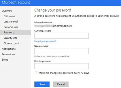 Hãy đặt làm sao cho mật khẩu của các tài khoản phải khác nhau ngoài việc kết hợp thêm chữ hoa, chữ thường, các số hay các kí hiệu (chẳng hạn như #, *…). Để thay đổi lại mật khẩu thì bạn truy cập vào địa chỉ này là được https://account.live.com/Password/Change.