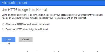 Hãy cẩn thận khi đăng nhập tài khoản Outlook.com từ các máy tính công cộng hoặc khi sử dụng mạng không dây không đảm bảo. Nếu bạn thường xuyên sử dụng máy tính công cộng hoặc các kết nối không dây thì bạn nên kích hoạt giao thức HTTPS để được an toàn hơn. Để thay đổi lại giao thức sử dụng, bạn truy cập vào địa chỉ http://tinyurl.com/cepu49b, sau đó chọn vào giao thức muốn sử dụng và nhấn Save để lưu lại thiết lập này.