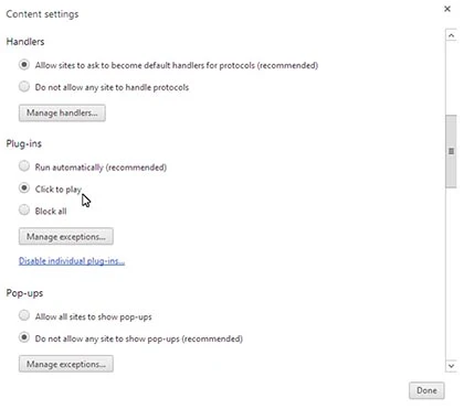 - Đối với Chrome: mở Settings > Show Advanced Settings > Content Settings (trong phần Privacy). Sau đó, bạn thay đổi lựa chọn ở mục Plug-ins thành Click to play là được.